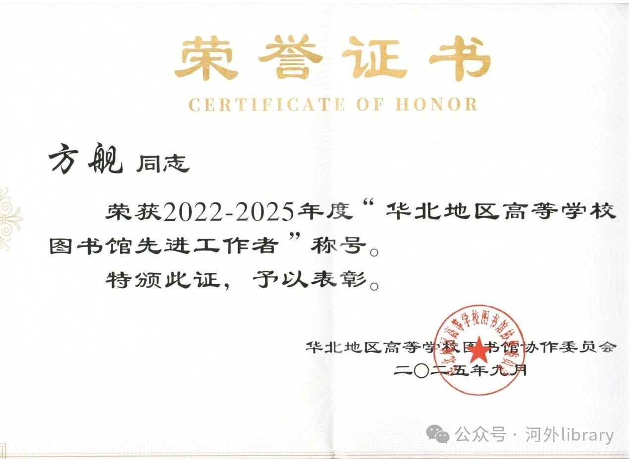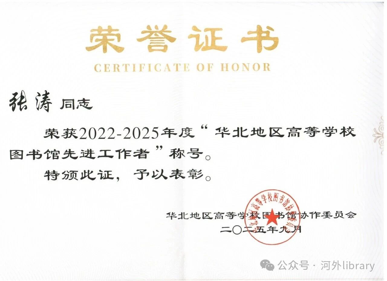 近日,华北地区高等学校图书馆协作委员会公布了2022-2025年度华北地区高等学校图书馆先进工作者评选结果,我校图书馆方舰、张涛两位老师荣获2022-2025年度“华北地区高等学校图书馆先进工作者”称号。