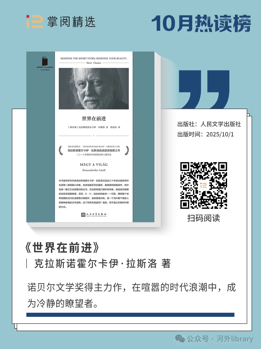 十月的时光悄然步入尾声,当我们回望这个承载着秋意与收获的月份,文学界的重磅消息无疑为其增添了浓墨重彩的一笔——万众瞩目的诺贝尔文学奖如期颁布,匈牙利作家克拉斯诺霍尔卡伊・拉斯洛凭借 “在末世恐惧中仍能通过震撼人心且具先知般洞察力的作品,重申艺术力量” 的创作摘得桂冠。他以独特视角审视社会结构与人性本质,让我们在快节奏的生活中停下脚步,重新思考 “世界在前进吗” 这一永恒命题,也为十月的阅读氛围注入了深刻的思想内核。