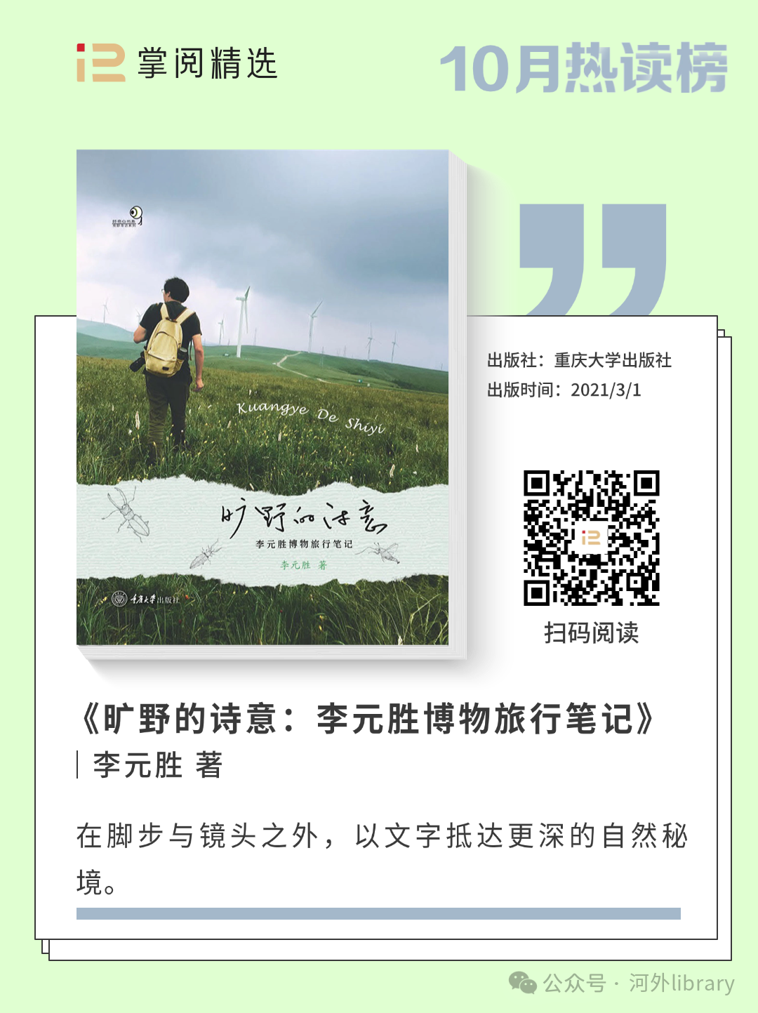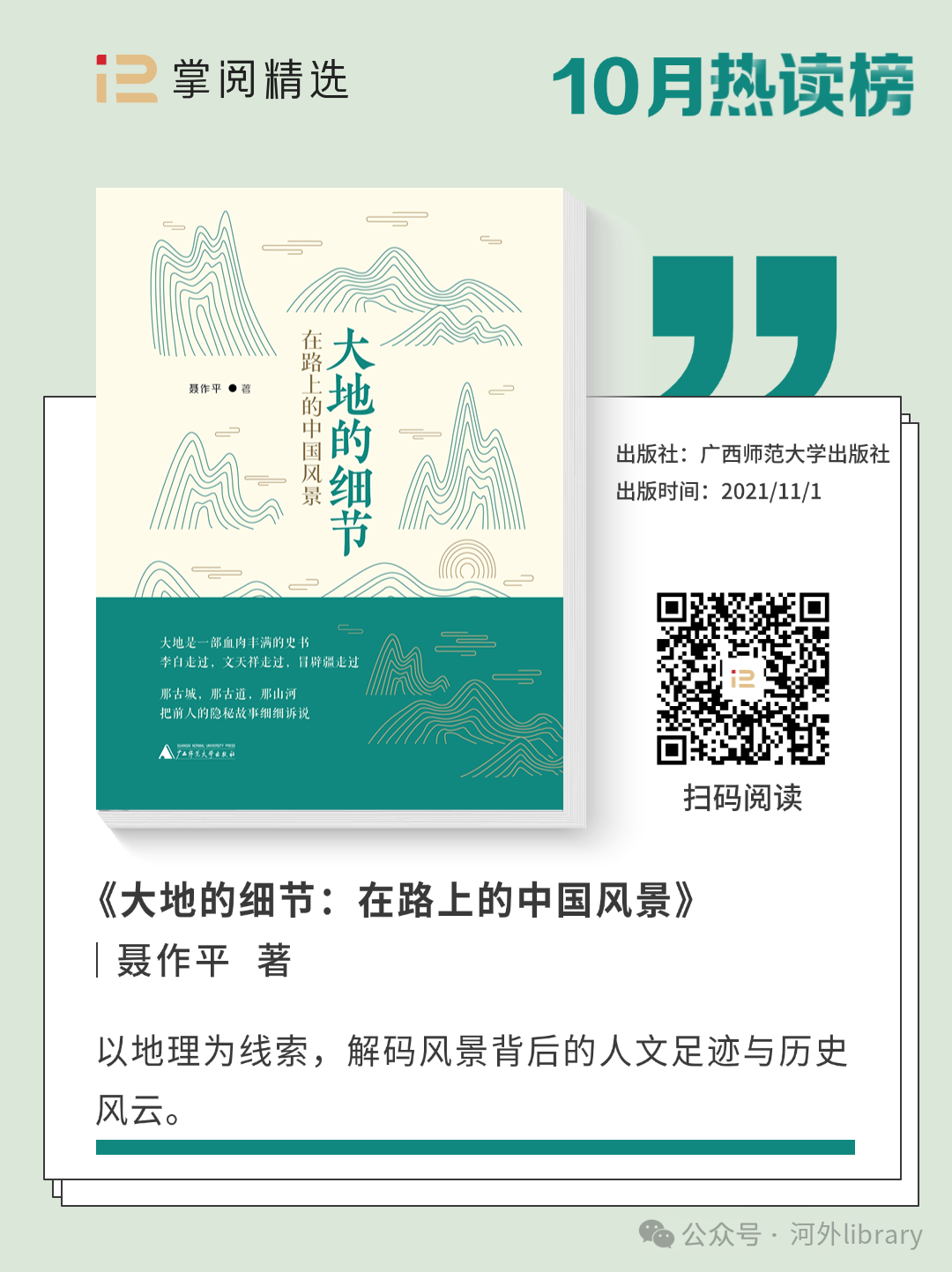 伴随着十月而来的,还有备受期待的“十一”黄金周。在这段难得的休憩时光里,人们或踏上旅途寻觅风景,或静坐书前畅游书海,《大地的细节:在路上的中国风景》一书恰好成为了连接两者的桥梁,它以细腻的笔触描绘中国大地上的多样景致,让你即便足不出户,也能跟随文字领略山河之美,成为黄金周期间的热门读物。