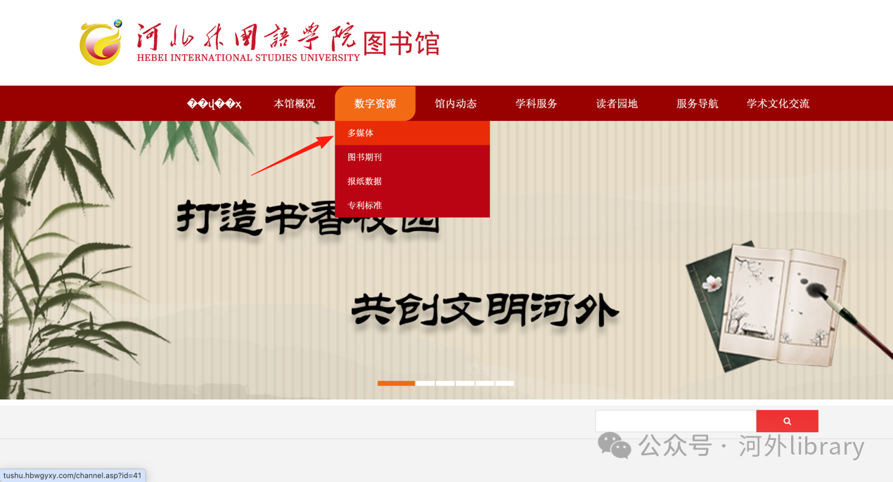 1、在校园网内打开河北外国语学院图书馆官网:http://tushu.hbwgyxy.com/index.asp