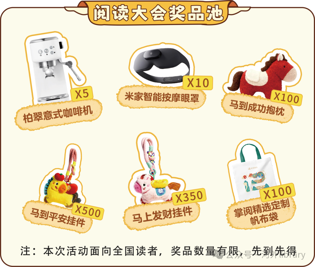 本次活动抽奖奖池共设置1000+份奖品,奖品内容如下:柏翠意式咖啡机5台,米家智能按摩眼罩10份,马到成功抱枕100份,马到平安挂件500份,马上发财挂件350份,掌阅精选定制帆布袋100份,掌阅精选定制文件袋45份。