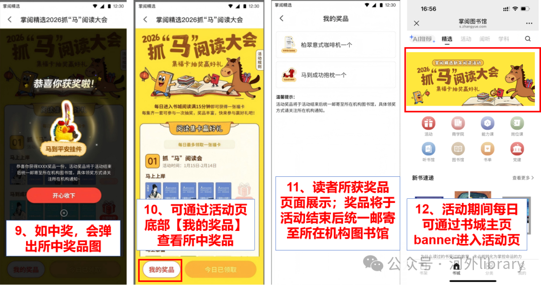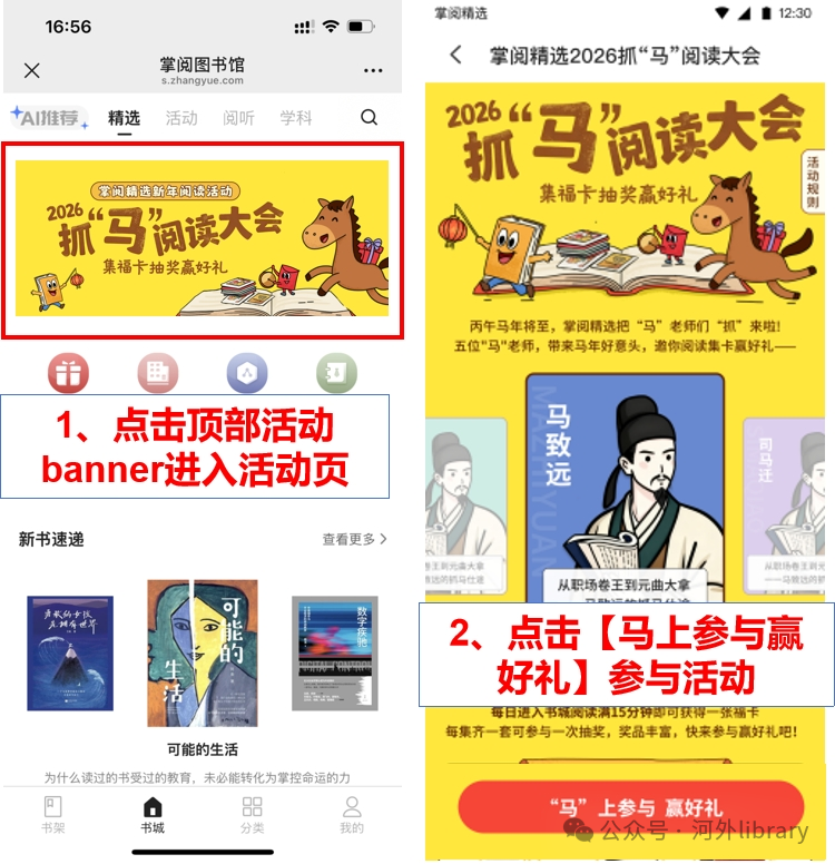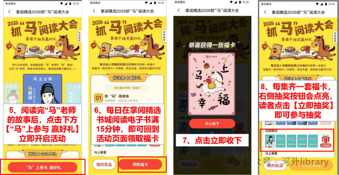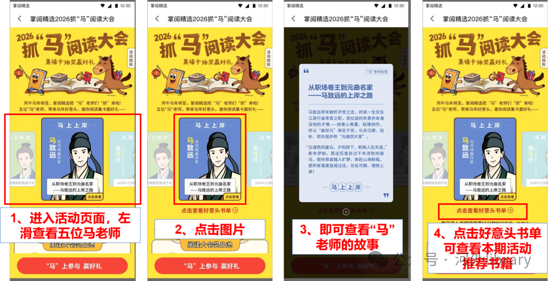 迎马年,真抓“马”!河北外国语学院图书馆联合掌阅精选特别策划2026抓“马”阅读大会活动,将5位与马相关的中国古代名人“抓”到本场活动中,与读者分享其精彩的人生故事,每位名人故事也引伸出一个马年好意头。读者阅读达标即可领取好意头福卡,集齐一套福卡即可抽奖赢马年好礼。